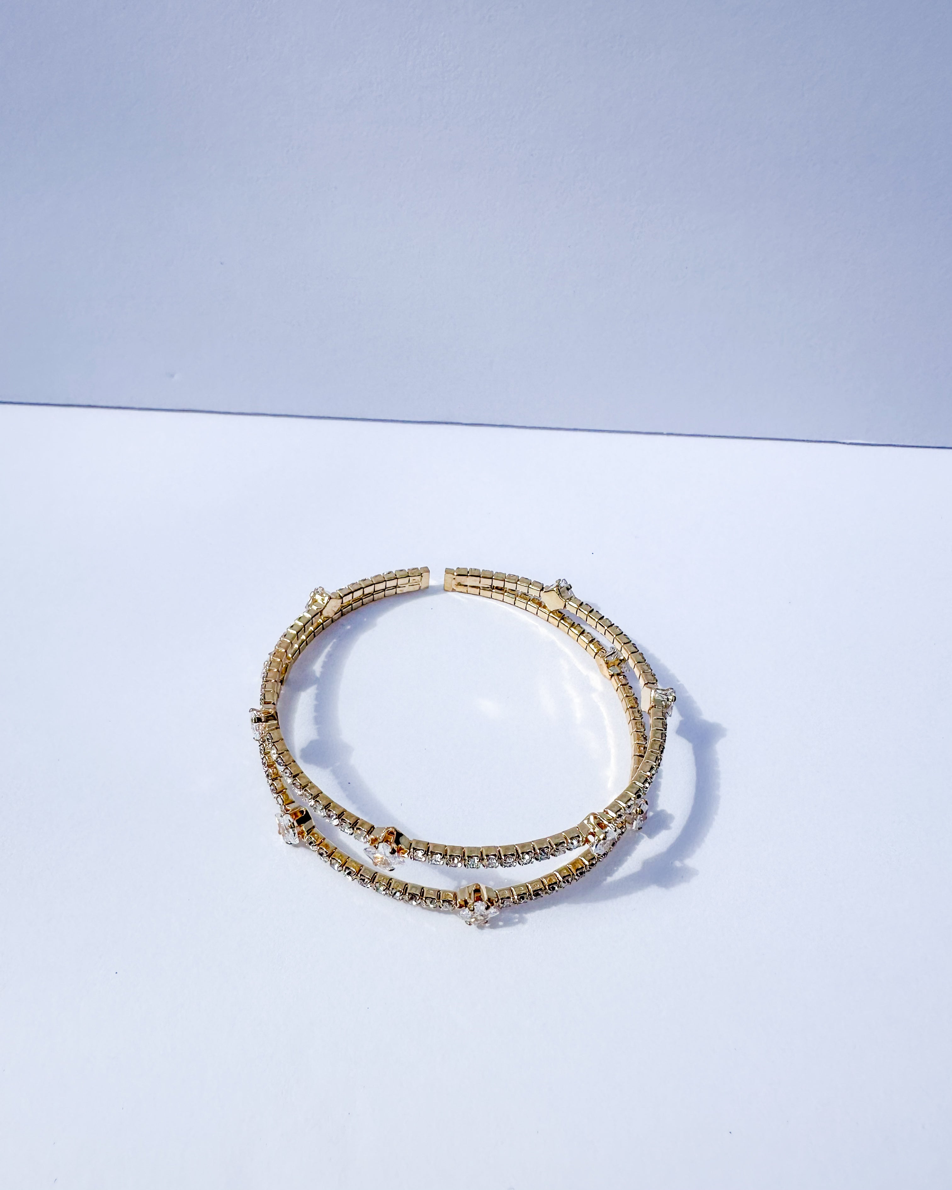 Turn heads twice with the Deux Luxe Bracelet- a double layered dream that brings twice the sparkle and double the elegance. Whether you're feeling golden or platinum-chic, this bangle catches light and elevates every outfit.